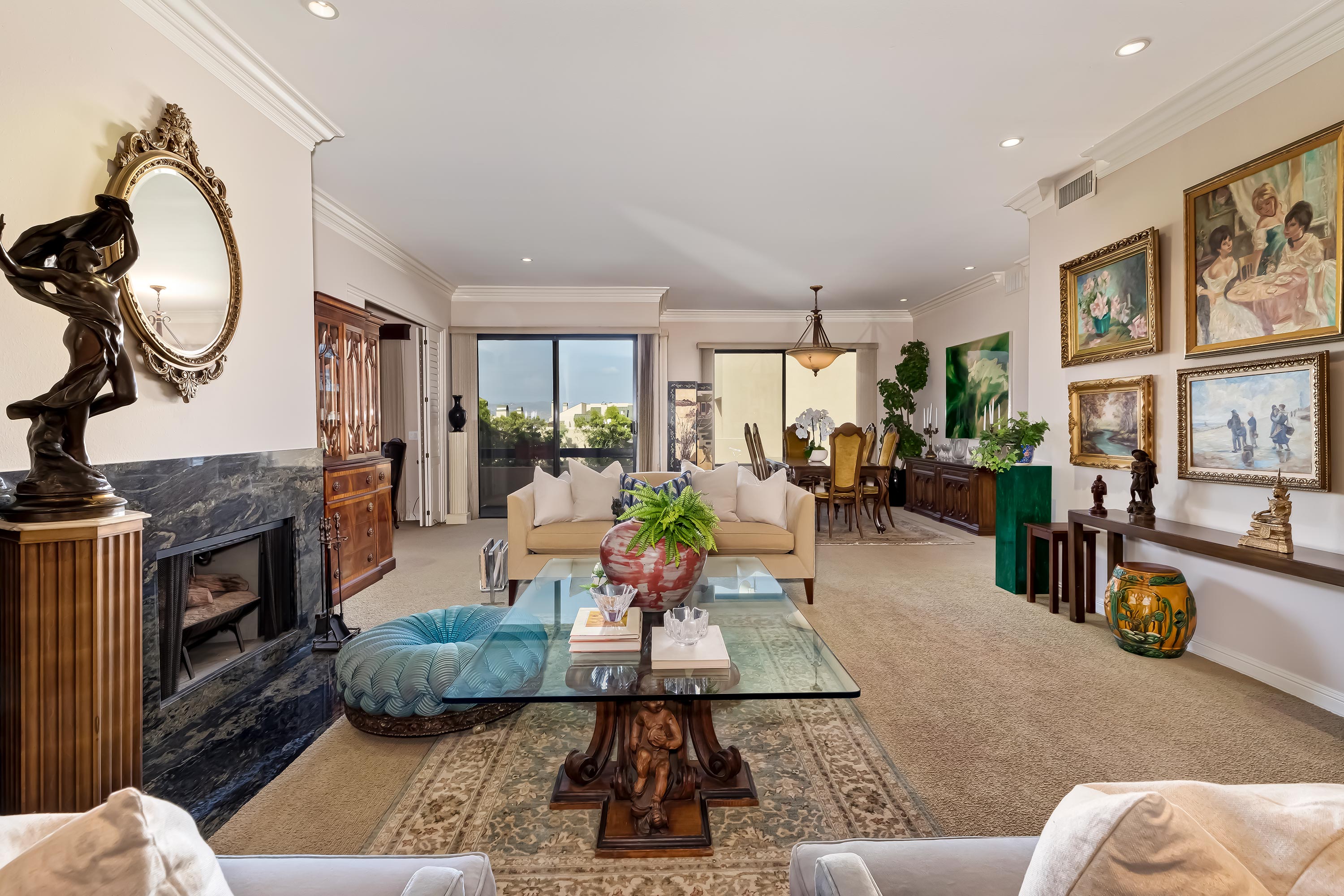 Trust Sale. Spacious light-filled one-level 2nd floor unit in Century City's most coveted full service gated community set on 18 acres and featuring bucolic gardens to explore and enjoy. High ceilings. Walls of glass. Great room with a sizable wet bar along with large living and dining areas opens to an oversized wrap-around terrace with peek-a-boo hill/city views. Huge primary suite with sitting area, fireplace, dual baths, and dual walk-in closets opens to the terrace. Secondary bedroom suite is set up as a den/office and opens to the Great Room and terrace. Updated stone-counter kitchen with top stainless appliances. Generous powder room. 24 hour security, guard gate, tennis courts, pools, spas, clubhouse, fitness center. 3 individual parking spaces and a storage room. 3D Tour available under the Virtual Tour tab above. Ready to be taken to the next level to fully experience the epitome of luxurious condominium living.